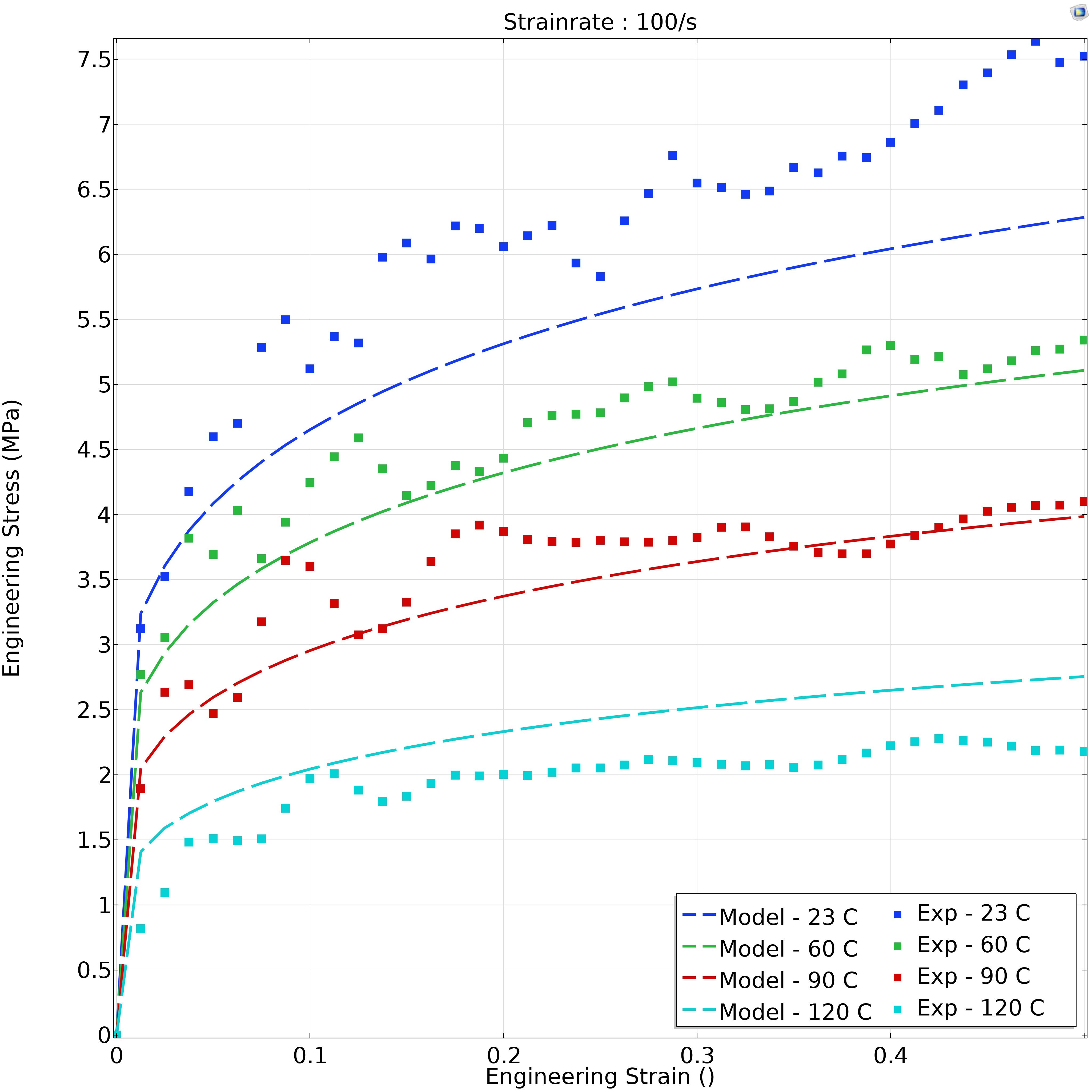 Figure 5. The plot shows the experimental data (square data points) as compared to the material model prediction (dashes).